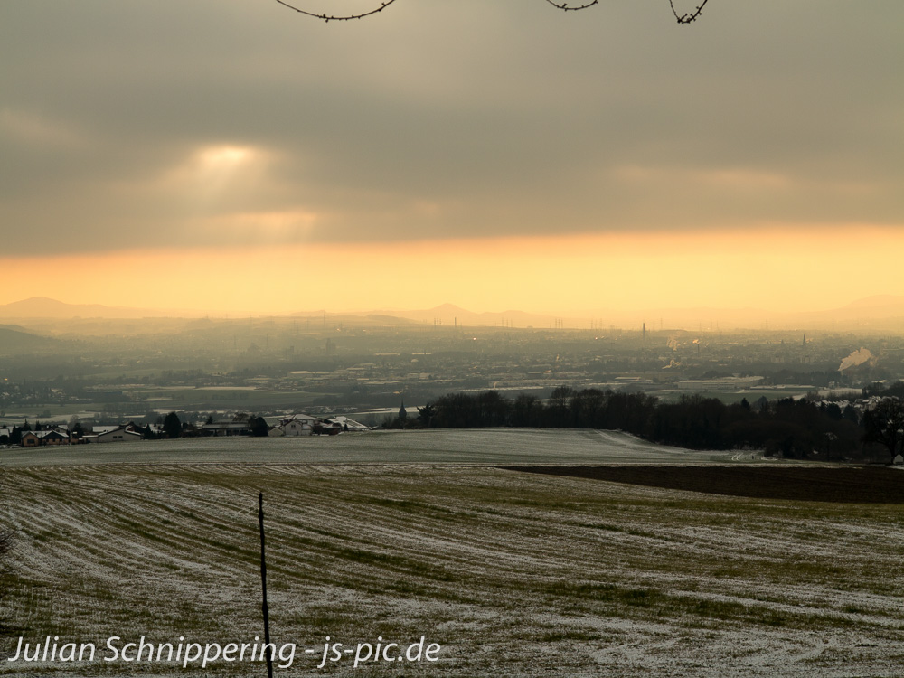 Nachdem man auf dem Höhenzüg ist wandert man vom Rhein weg hinein ins Land, immer den blauen Rheinsteigzeichen folgend. Die Ausschilderung ist wie immer bisher extrem gut gewesen. Aufgrund des Schnees musste ich zwar 2-3 mal ein bisschen raten, mit Hilfe der Rheinsteig Karte war es aber kein Problem.
